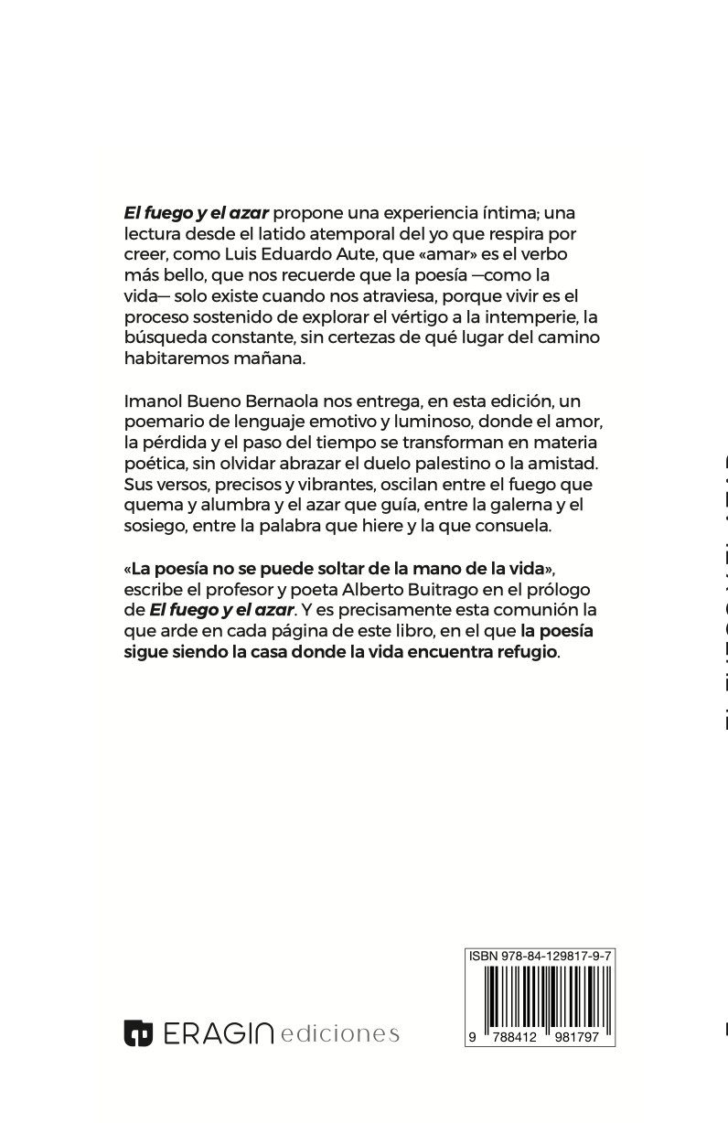 Imanol Bueno Bernaola nos entrega, en esta edición, un poemario de lenguaje emotivo y luminoso, donde el amor, la pérdida y el paso del tiempo se transforman en materia poética, sin olvidar abrazar el duelo palestino o la amistad. Sus versos, precisos y vibrantes, oscilan entre el fuego que quema y alumbra y el azar que guía, entre la galerna y el sosiego, entre la palabra que hiere y la que consuela.